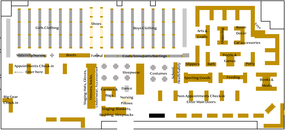 Below is a map of how the sale is planned to be set up, to help you find the area you will need to put your items. It was made in Excel to help measure out the space, so forgive the boxy nature of the graphics. This is a drop-off map; some locations will change as we shift the floor from check-in to sales. Note that this plan may also change as items fill up the sale and we find we have more or less of something than anticipated. Bear with us!